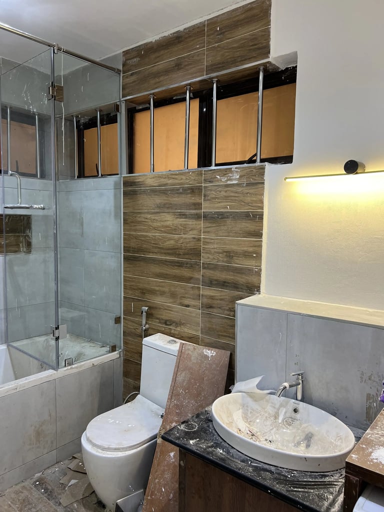 The master bedroom was enhanced with new built-in wardrobes and a dedicated workspace. The master bathroom was fully reconstructed with new sanitary fittings, modern tiling, and integrated storage, including relocation of the laundry area for better space planning. The corridor was upgraded with sunken custom shoe racks and modern lighting, while the guest bathroom received a new instant shower system.