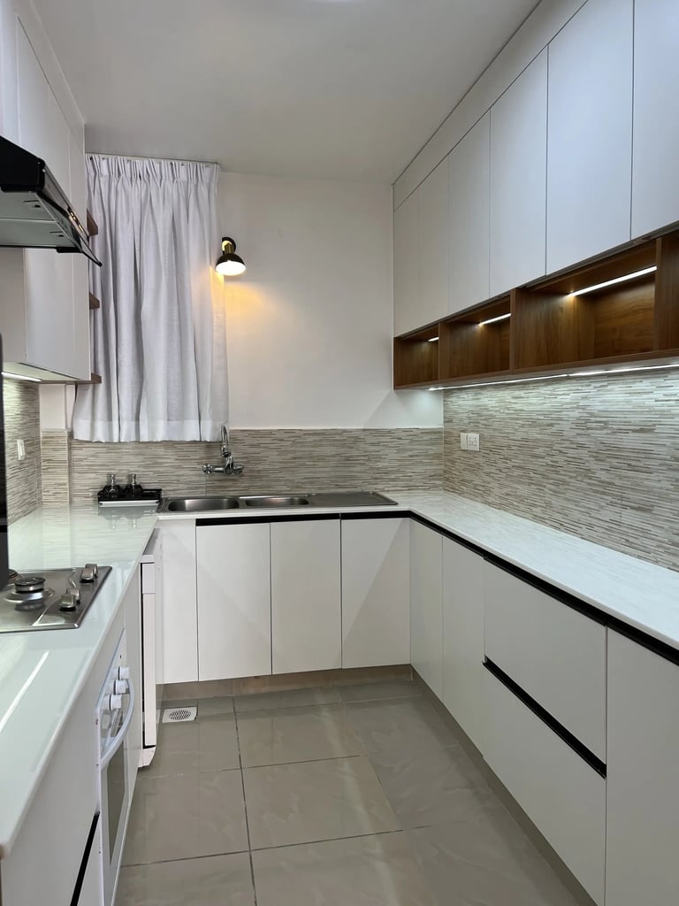 The renovation began with full demolition of outdated cabinets, bathroom fixtures, and interior elements. The kitchen was rebuilt with custom cabinetry, granite worktops, and a new separator with a bar area to improve flow between spaces. The living and dining areas were repainted, upgraded with new lighting, and fitted with custom woodwork and curtain systems.