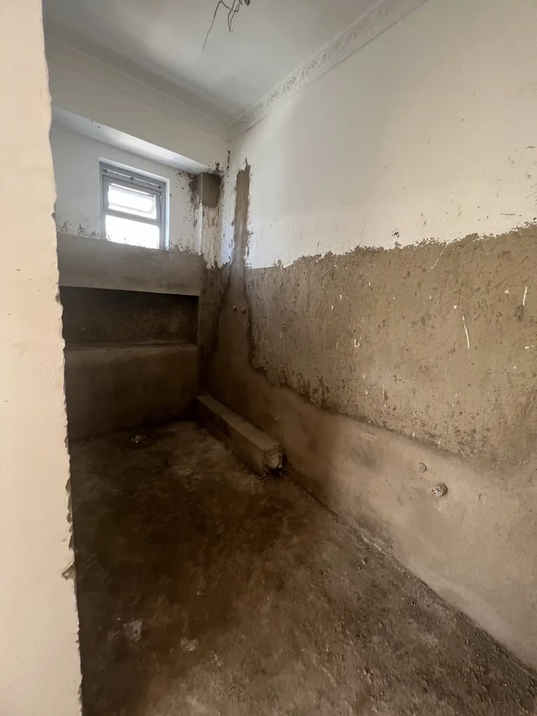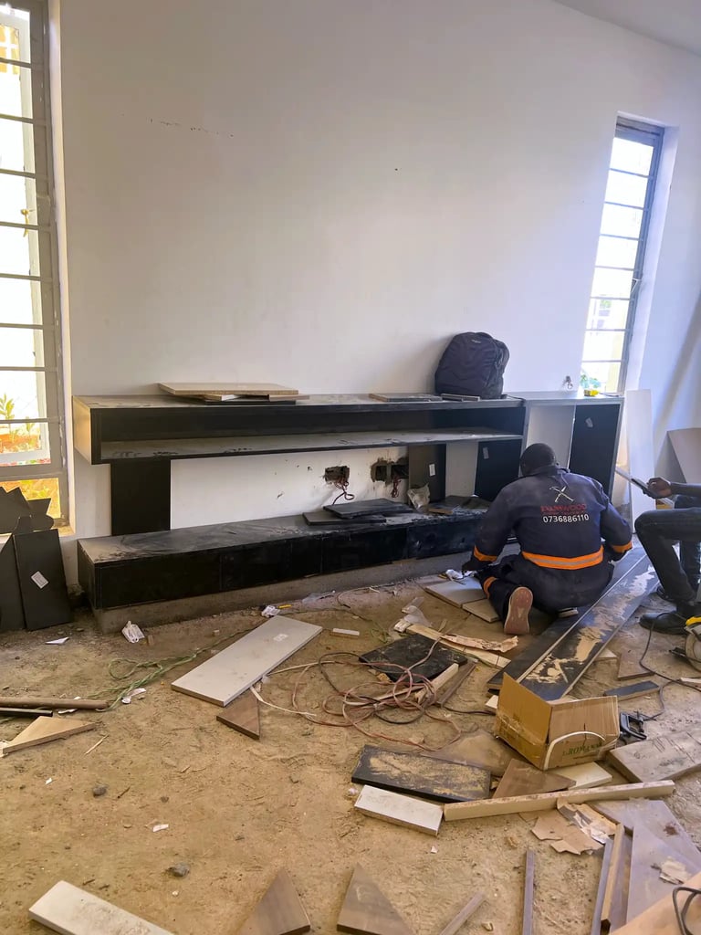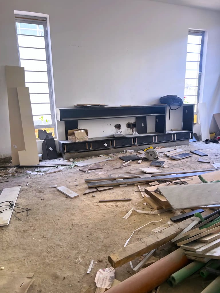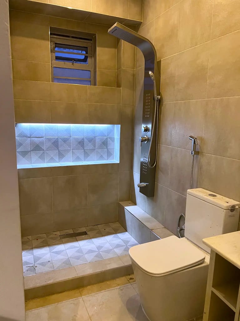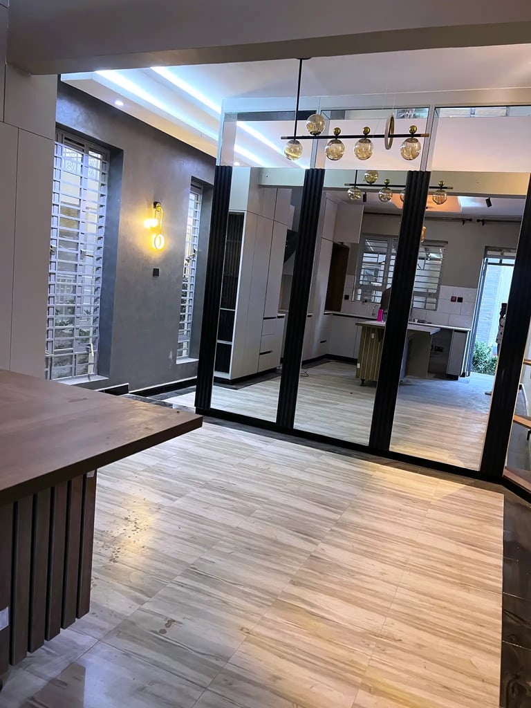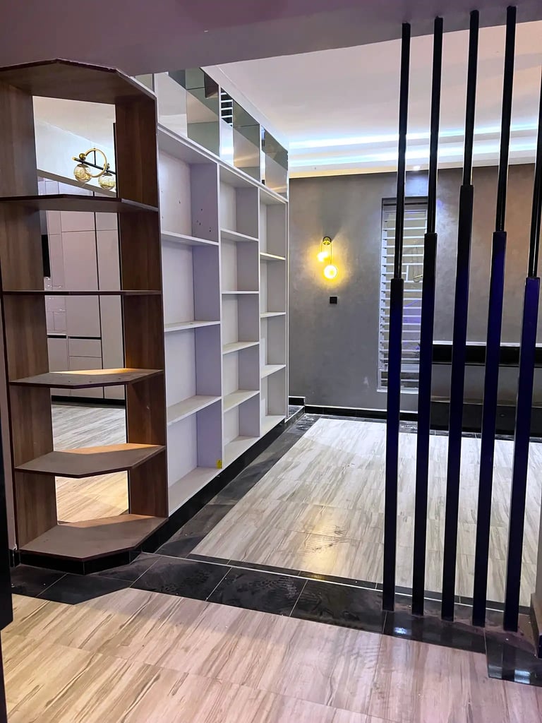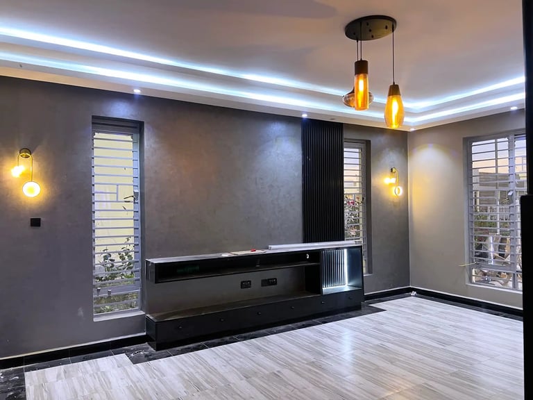 The renovation introduced architectural features, material upgrades, and custom-built elements across the home. The living room was enhanced with a custom TV unit with fireplace, modern lighting, tiling, and a sunken lounge to create depth and character. A mixed wood and metal separator was installed to define spaces while maintaining openness.